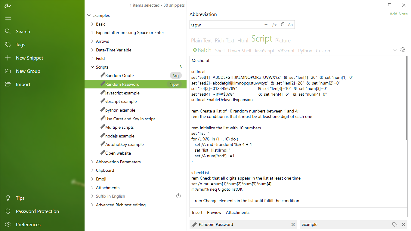 Built-in snippets for misspelling correcting, HTML and JavaScript coding, emojis.